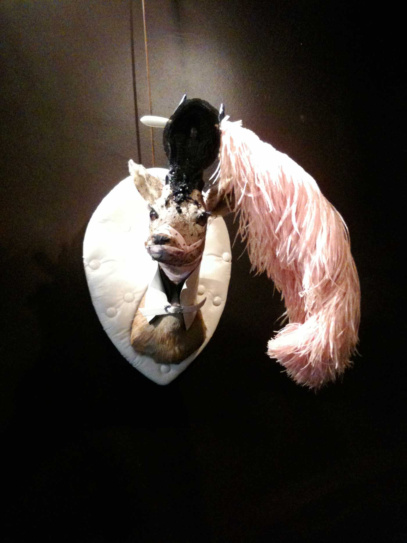 L’artiste Sophie Cabanne est animée par l’envie de donner une deuxième vie à des trophées oubliés qu’elle chine lors de vide-greniers ou sur internet. Son métier de styliste/couturière apporte « le petit plus » qui fait toute la différence : plume, soie, cuir … Pour ce faire, elle coud, coupe, coiffe, habille, capitonne et les pare des plus beaux atours, le tout dans le respect de l’animal.