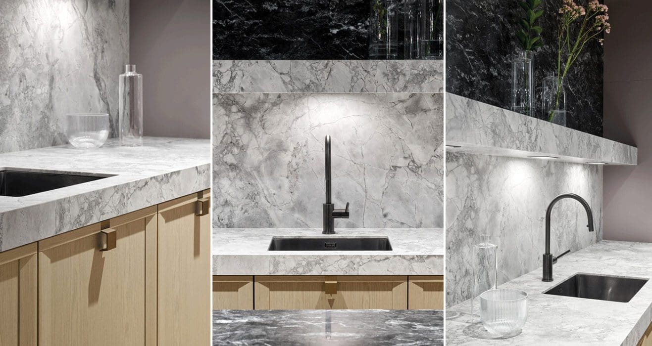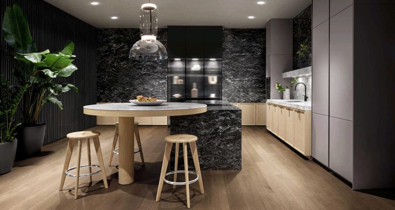 L’univers SieMatic Mondial réinterprète les codes de l’aménagement de la cuisine pour en faire un espace de vie épuré propice à la convivialité. Ainsi, la pierre naturelle au veinage marqué, à l’instar du marbre ou du quartzite, sublime la géométrie spécifique aux nouvelles façades à cadre en placage de chêne SieMatic.