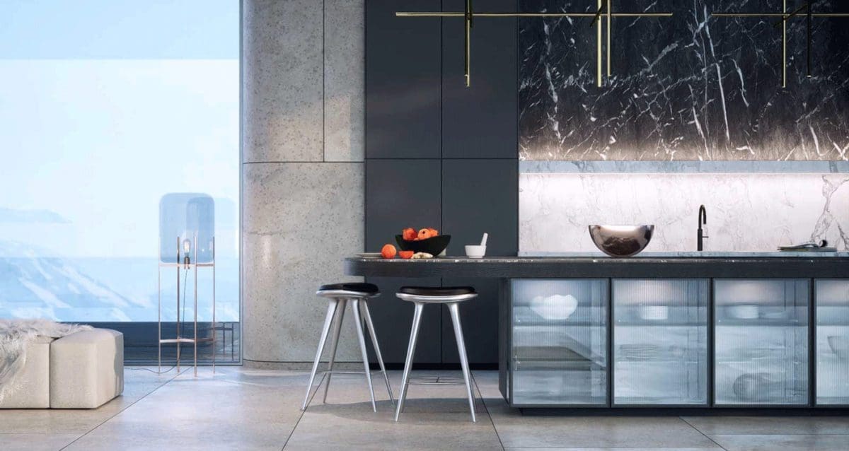 En effet, ces vitrines se distinguent par leur vitre en relief et leur cadre anodisé en filigrane. De quoi révéler complètement l’approche sculpturale de SieMatic Mondial, entre formes géométriques claires et équilibre d’éléments fins et massifs.