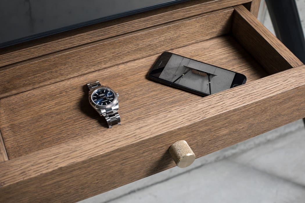 La création au style résolument moderne et esthétique, présente un petit tiroir en bois sophistiqué qui tranche avec la matière et le coloris sobre de la structure, afin d’apporter un nouveau souffle au mobilier classique. Les lignes fortes, ainsi que la silhouette minimaliste séduisent tous les intérieurs contemporains.