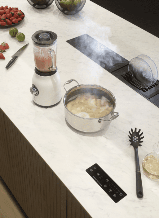 Voilà quelques années que Porcelanosa travaille sur une « smart kitchen », cuisine intelligente, qui facilite (grandement) la vie de ses usagers. Parmi les innovations les plus récentes, la technologie Duale, cachée sous le plan de travail, qui permet de convertir ce dernier en plaque de cuisson ou d’y faire fonctionner des appareils électroménagers ou des téléphones par induction. Une avancée technologique, ergonomique mais aussi esthétique puisque ce système peut s’adapter par exemple à des cuisines en pierre naturelle ou en grès cérame…