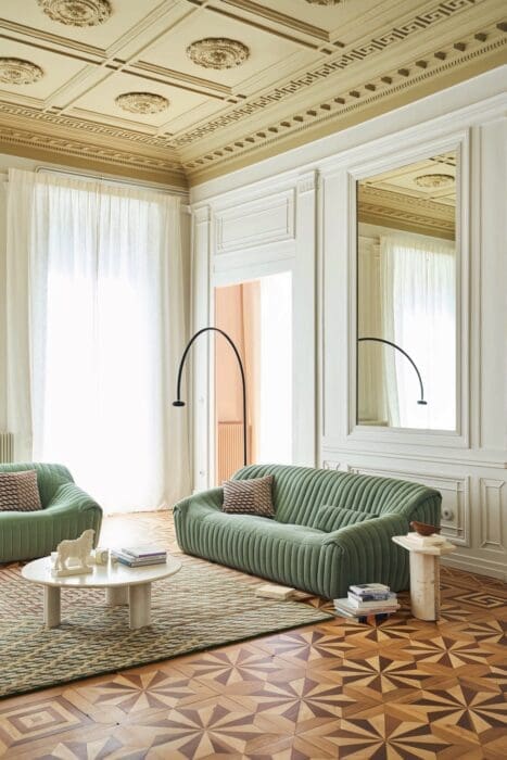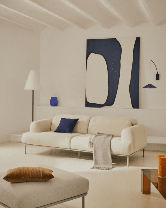 Si le modèle aux lignes angulaires reste un indémodable, le canapé affichant un design plus sinueux lui fait de l’ombre depuis plusieurs saisons. Plus tendre, moins rigide, il se montre enveloppant tout en apportant du dynamisme au salon. Son design organique évoque également la nature, un atout indéniable pour les espaces en quête d’apaisement. Parmi les canapés arrondis se trouve le modèle incurvé, dit haricot, dont la forme maximise la convivialité en rapprochant physiquement les personnes assises dessus. Très élégant et plus sophistiqué qu’un modèle droit, il est aussi gage de confort grâce à ses formes épousant naturellement celles du corps. Apprécié des grandes pièces pouvant se montrer froides et impersonnelles, le canapé incurvé prend plus de place puisqu’il ne peut pas raser les murs ni se lover dans un angle. Question look, il n’a pas froid aux yeux : son design s’exprime en couleurs pour un meuble qui aime se faire remarquer. Les modèles écrus assureront un rendu plus chic et intemporel.