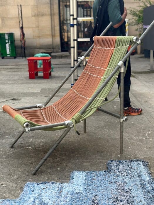 Sans doute l’une des propositions collectives les plus denses et les plus innovantes : une vingtaine de jeunes créateurs, français et internationaux, pense le design du mobilier urbain par le prisme du changement climatique : matériaux standardisés détournés, réemploi élégant du maillage d’un cageot en plastique pour la table de Ping-Pong de Simon Geringer, ou encore du détournement de briques de construction pour la création de tabourets – Selettes chez le lillois Aurélien Veyrat.