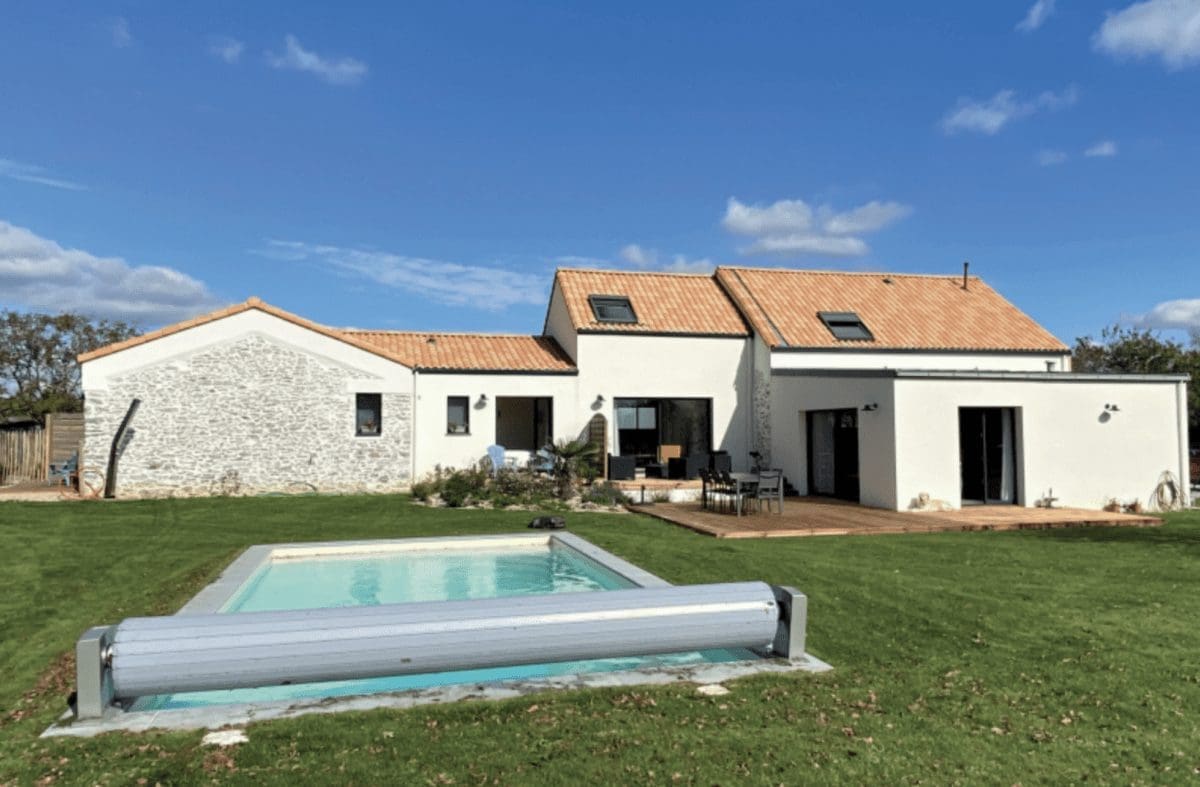 Ce superbe vestige du bâti ancien permet de gagner l’étage, et notamment la suite parentale. Sous les toits dans la chambre d’enfant, dans la pièce d’eau de l’une des chambres d’hôtes, en façade… le concessionnaire Trabeco Loire-Atlantique a fait la part belle aux pans de pierres apparentes conservées et soigneusement rénovées. Ces pans se fondent harmonieusement entre leurs nouveaux murs, et apportent cachet et authenticité au décor épuré et contemporain choisi par la cliente. Grâce à de larges baies vitrées à galandage, le rez-de-chaussée dialogue avec des extérieurs pensés comme prolongement naturel de la maison, avec terrasses en bois et piscine. Non contentes d’encadrer à merveille le paysage, ces ouvertures baignent de lumière les espaces intérieurs, de la cuisine au bureau cloisonné par une verrière, et complètent le confort thermique d’un chauffage au sol. Preuve s’il en est que les exigences d’une rénovation peuvent être conciliées avec celles des maisons contemporaines signées Trabeco : espace, lumière et confort. Un vrai luxe !