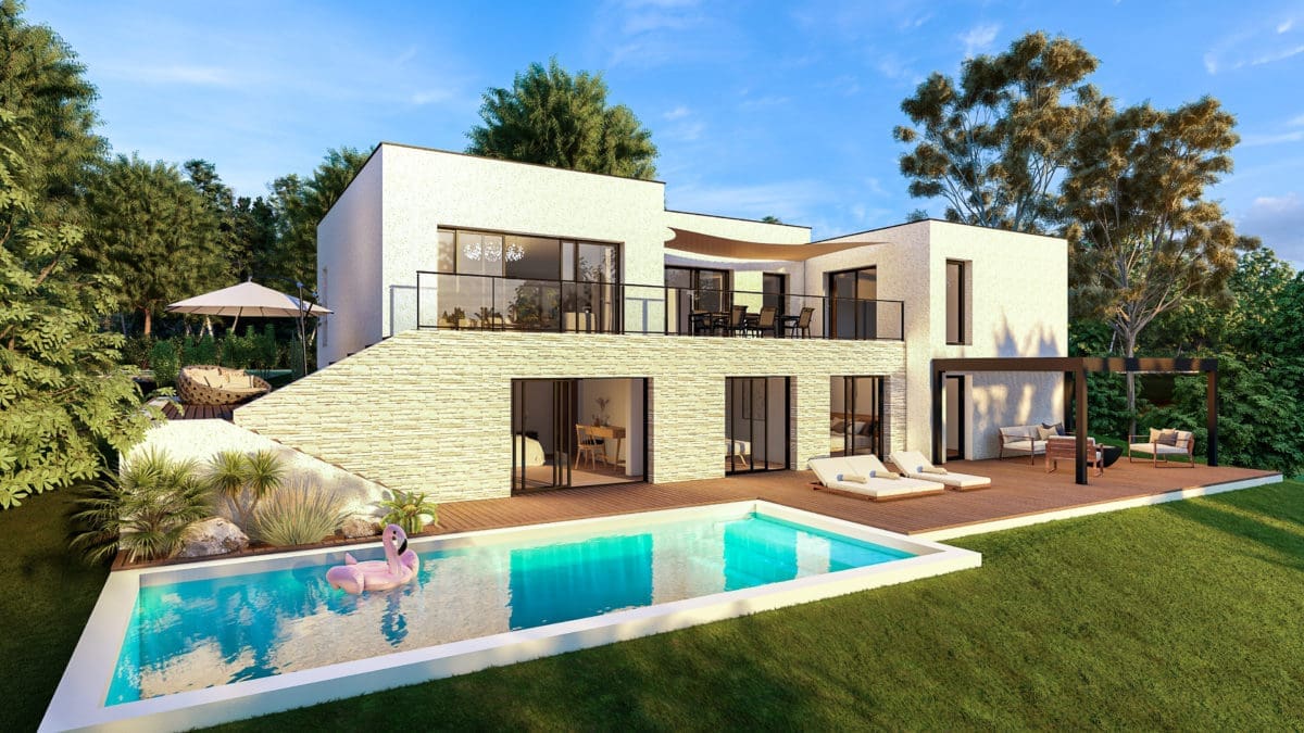 Entièrement paysager, l’espace extérieur, orchestré autour d’une piscine de 4 mètres sur 9, se déploie vers l’arrière de la construction, garantissant l’intimité des propriétaires. Résolument contemporaine, avec ses volumes sobres et épurés habillés d’enduits de façade et de parements en pierre, coiffée de toitures-terrasses végétalisées, cette maison à l’esprit minéral se fond parfaitement dans la campagne alentour. Réparties sur plusieurs niveaux, les terrasses, de 100 m2 au total, permettent de multiplier les points de vue et de profiter de chaque moment de la journée aux beaux jours. Les vastes pans de surfaces vitrées (elles représentent 20 % des façades) achèvent de fondre ce lieu de vie d’exception dans son environnement, en gommant la frontière entre dehors et dedans. L’intérieur profite en prime de ce généreux apport de lumière, augmenté par un éclairage zénithal apporté par des fenêtres de toits Velux® et une triple orientation dans la grande pièce de vie. Dotée de menuiseries en aluminium et PVC anti-effraction à hautes performances thermiques et acoustiques, d’un gestionnaire bioclimatique des occultants avec centralisation et d’une pompe à chaleur avec plancher chauffant, cette habitation familiale est enfin connectée et peu énergivore. Sans pour autant faire l’impasse sur le style ! Dans les chambres, une suite parentale de 22 m2 et deux vastes espaces nuit de 14 m2, un parquet stratifié chanfreiné grand passage apporte une note chaleureuse, tandis que dans les pièces d’eau faïence toute hauteur et robinetterie thermostatique noire Porcelanosa signent un vrai sens du raffinement.
