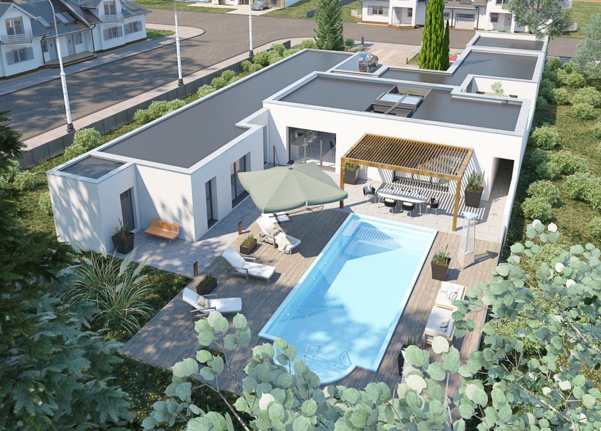 « La ventilation se fait en fonction de sondes et de la programmation de la domotique, de même que tous les systèmes d’ouverture », précise Bruno Pleuchot, concessionnaire Trabeco (44). Un élégant patio végétalisé de 80m2 au cœur de la pièce de vie et un jardin zen permettent enfin de gommer les frontières entre l’intérieur et l’extérieur. Quant à la grande terrasse en teck, qui donne sur une splendide pergola, et à la piscine, elles appellent à partager d’agréables moments, en famille ou entre amis.