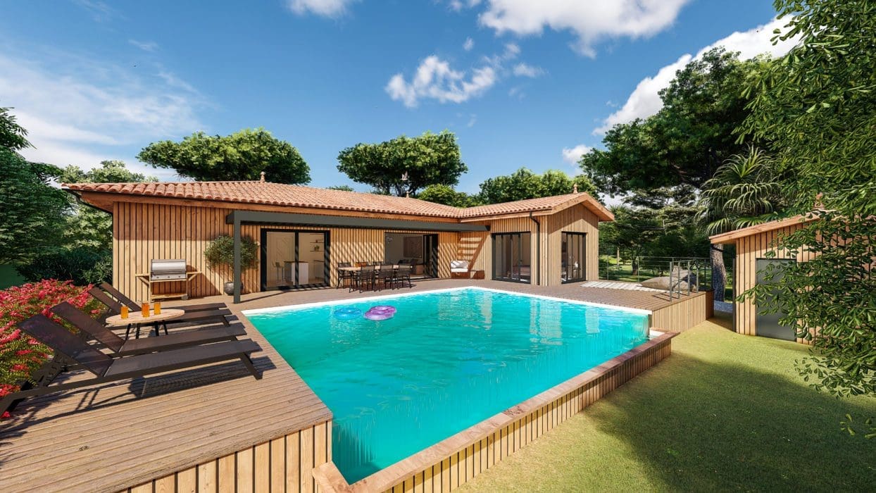Le patrimoine architectural du bassin d’Arcachon, connu pour ses cabanes ostréicoles typiques et pleines de charme, a largement inspiré cette construction de plain-pied de 150 m2, érigée par Trabeco Gironde. Bardée de bois, cette maison proche de la nature bénéficie d’un jardin paysager et d’une orientation bien pensée : l’entrée, coiffée par un porche en bois « arcachonnais », est exposée au nord-est, tandis que l’arrière de la maison, plus intime, se dore au sud-ouest, invitation à profiter de la grande terrasse abritée par une pergola bioclimatique, et prolongée par une piscine à débordement. À l’intérieur, le vaste salon-séjour décloisonné de 50 m2 et la cuisine ouverte qui le jouxte s’ouvrent en grand sur la terrasse grâce à une large baie vitrée coulissante, jouant la carte du dedans-dehors. Même chose pour la généreuse suite parentale de 25 m2, dotée de sa salle de bains privative et d’un dressing, qui donne vue sur cet extérieur propice à la convivialité. Outre ces beaux volumes baignés de lumière, les propriétaires jouissent également d’espaces pratiques – cellier, local de rangement et garage.