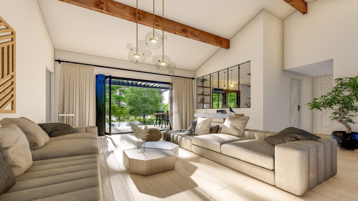Exerçant pour l’instant à Tahiti, un couple de chirurgiens originaires du sud de la France rêvait de traverser les océans dans l’autre sens pour prendre sa retraite, et, avant cela, de profiter d’une résidence secondaire au bord de la mer, où recevoir leurs deux grands enfants et leurs amis. « Dénicher l’écrin idéal pour leur projet était primordial », soulignent d’emblée Albert de Rambures, concessionnaire Trabeco Gironde, et son collaborateur Renaud Laden, aux manettes de sa mise en œuvre. Niché au sein d’un site naturel classé arboré de pins centenaires, un terrain en pente de 1000 m2 s’est imposé. À 300 mètres des plages du bassin, à 11 minutes seulement de l’océan, le secteur recherché du cap Ferret, proche des restaurants et des commerces, était en prime facilement accessible à ces grands voyageurs via l’aéroport de Mérignac.