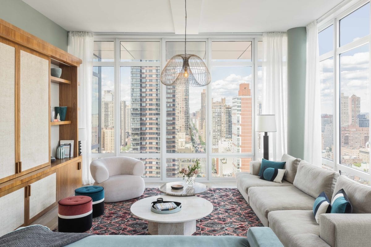 Perché au vingtième étage d’une tour de l’East Village, sur la très branchée première avenue, cet appartement vitré livre la ville de toutes parts. Défi de Sarah Poniatowski : le rendre chaleureux.