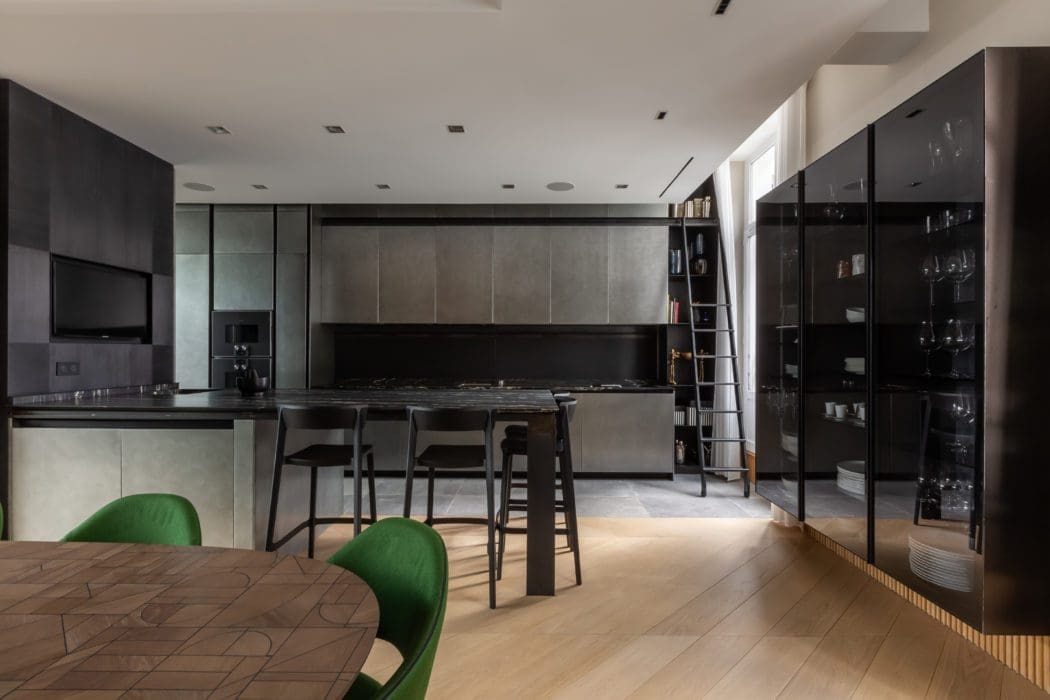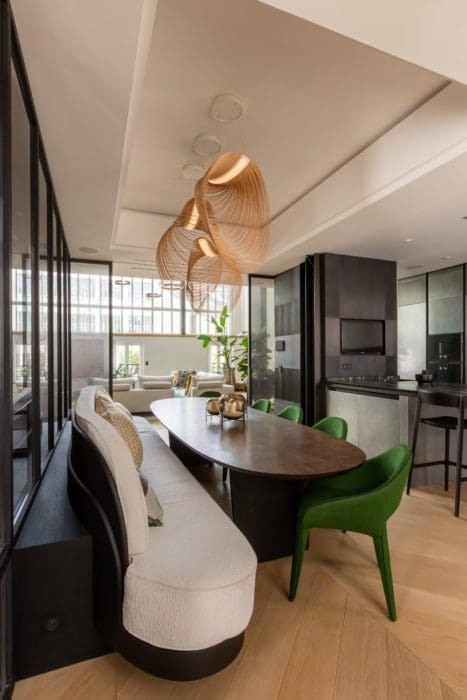 Ainsi, dans les pièces à vivre au premier niveau du triplex – salon, boudoir, salle à manger, cuisine –, les matières brutes sans transformation sophistiquée sont privilégiées.