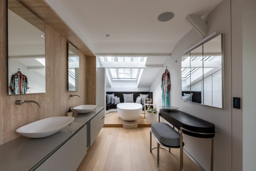 Quelques marches encore et l’on parvient au dernier étage. Sur un plateau de 100 mètres carrés, la suite parentale, chambre, salon, boudoir, salle de bains, gravite autour d’un patio tantôt rooftop à ciel ouvert, tantôt jardin d’hiver avec sa verrière zénithale qui s’ouvre et se referme grâce à un système à crémaillère breveté Saint-Gobain.