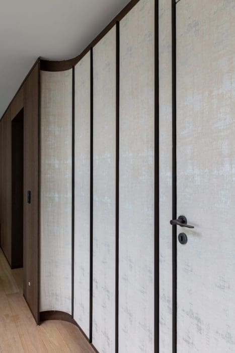 Peu, très peu de peinture, mais du bois, de l’acier, de la pierre, du marbre, du travertin, des enduits travaillés pour capter la lumière, des plinthes cannelées qui témoignent du savoir-faire des artisans avec, en point d’orgue, l’escalier à vis monumental en tôle patinée du living-room.