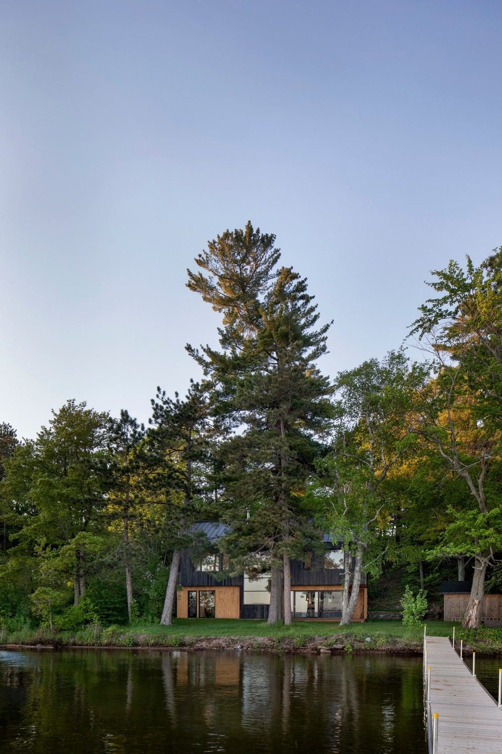 Oasis qui émerge au rythme des activités de plein air, le Chalet Noir s’insère dans le panorama du Lac Brome, dissimulé dans les arbres, il se démarque par sa forme iconique. Le nouveau bâtiment participe a la vie active des familles des deux frères propriétaires agissant comme lieu de repos et espace de rencontre. Son attrait incite a être plus actif au quotidien. Placé en bordure du lac, la fissure dans le bâtiment permet la contemplation de la nature.
