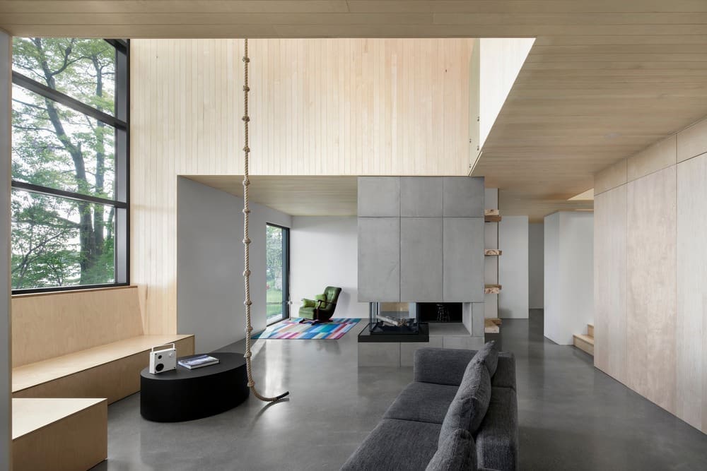 De grandes baies vitrées verticales à l’avant et à l’arrière divisent la maison en deux et offrent un « corridor visuel » vers l’extérieur, à l’intérieur ceci divise le deuxième en deux zones pour les deux ménages. Cet espace interstice au centre de la maison accueille l’escalier, le « pont » et le séjour.