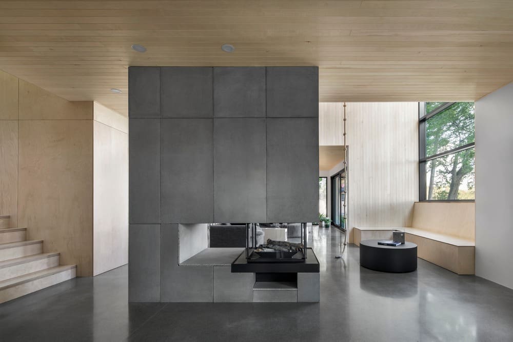 Chaque pièce est pensée, dessinée, puis coupée par une CNC, des instructions d’assemblage ont été produites et sont fournies. Finalement, le foyer a été conçu sur mesure, sur la base d’un foyer homologué, il est revêtu de panneaux de béton artisanaux installés en surface de manière à ne pas en altérer les mécanismes. Cet exercice permet de dissimuler le foyer d’origine et de conférer une identité unique au centre de la maison.