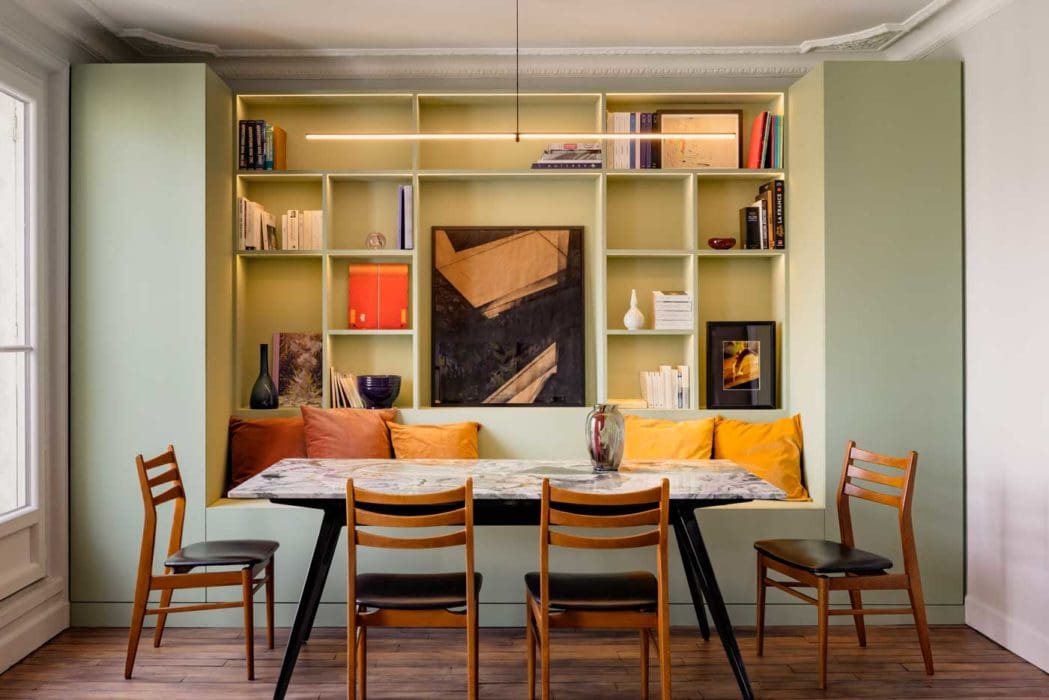 Salle à manger-bibliothèque, peinture amande, mat poudré, réf. « SC203A », Ressource. Meuble avec banquette et colonnes de rangement, création Thibaut Picard. Suspension, « Arrangements Line » de Flos. Table réalisée sur mesure par un marbrier.