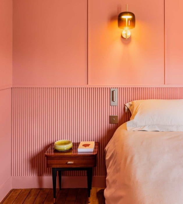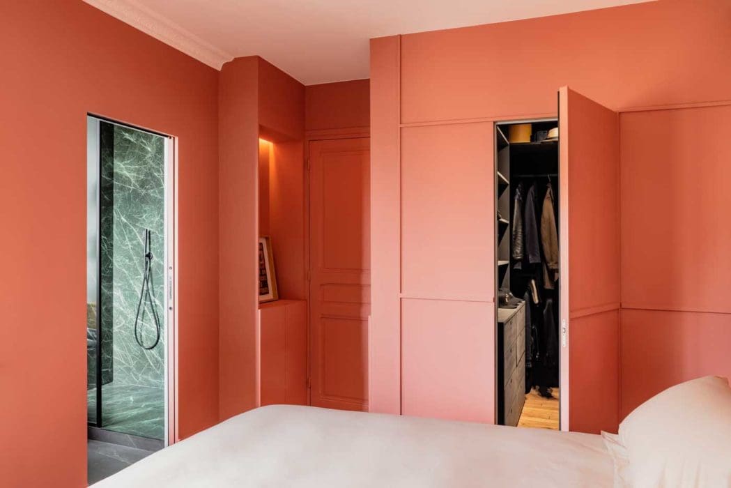 « Comme un gamin, raconte l’un des propriétaires, je rêvais d’une pièce secrète. Notre architecte s’est pris au jeu… Dans la chambre, d’un rose s’enrichissant de nuances ocre à la lumière du soir, il a dissimulé un dressing. Et, pour brouiller les pistes, a multiplié à l’envi les moulures sur les murs et même en tête de lit. Je souhaitais aussi pouvoir occulter la salle de bains. Pour ne pas perdre de place, Thibaut a doublé la paroi de verre d’une porte coulissant, comme dans une suite. Comme dans une suite aussi les liseuses, les prises aux bons endroits et les mille détails qui nourrissent l’illusion de vivre à l’hôtel. »