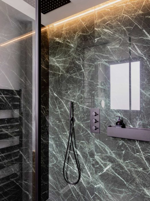 Dans la petite salle bains, pas de baignoire, mais une grande douche à l’italienne de 1 m sur 1 m 60. Robinetterie de la maison anglaise Lusso. Le grès cérame a été taillé sur mesure par un marbrier dans deux grandes plaques pour éviter les joints.