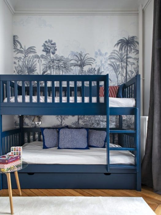 Quant aux trois chambres d’origine, desservies par un long couloir qui longe l’espace intérieur de la cour, elles conservent leurs proportions et leur caractère fin XIXe, tout en affichant une allure pimpante et contemporaine. Elles ont été pensées comme des respirations, des invitations à l’évasion, au voyage, avec des panoramiques monochromes d’Isidore Leroy. « J’ai choisi du mobilier d’une simplicité extrême que j’ai personnalisé, comme les lits superposés Ikea de la chambre des garçons que j’ai peints en bleu, en harmonie avec le papier peint.Celles des deux filles est plus baroques, plus girly. » Preuve qu’il est possible de marier intelligemment passé, présent… et avenir.