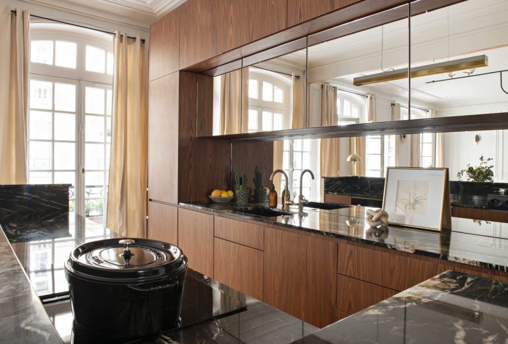 En accord avec les propriétaires, Nicolas Bossard décide donc de la déplacer dans la partie réception traditionnelle qui compte, en enfilade, séparées par une double porte, une vaste salle à manger et un salon aux dimensions généreuses. Il dessine une cuisine sur mesure semi-ouverte qui s’intègre avec élégance et discrétion au côté living. « J’ai conçu le sas et l’îlot afin qu’assis autour de la table de la salle à manger, les convives ne voient aucun appareil ménager, four, plaque de cuisson, hotte, frigo, etc. » C’est réussi !