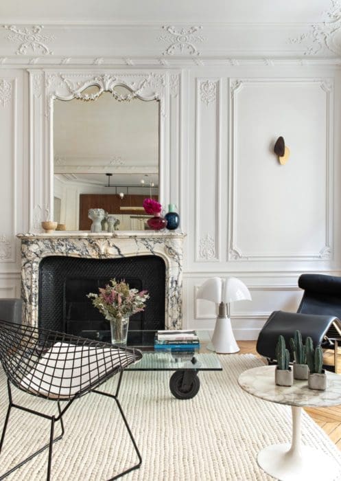 Puis, pour conserver une surface agréable à l’espace voué aux soirées, aux fêtes, aux dîners, le décorateur retire les doubles portes, apportant ainsi de la profondeur. « J’ai remis en état les parquets, refait les fenêtres à l’identique et récupéré les crémones d’origine pour les laquer. » Les ouvertures ont été équipées d’un double vitrage pour une meilleure isolation thermique et phonique, mais aussi d’un système antieffraction, le premier étage étant la cible favorite des cambrioleurs. Tout a été restauré et peint en blanc, les moulures, les trumeaux, les miroirs, le stuc. Loin de gommer le style d’origine, il fallait, au contraire, le sublimer.