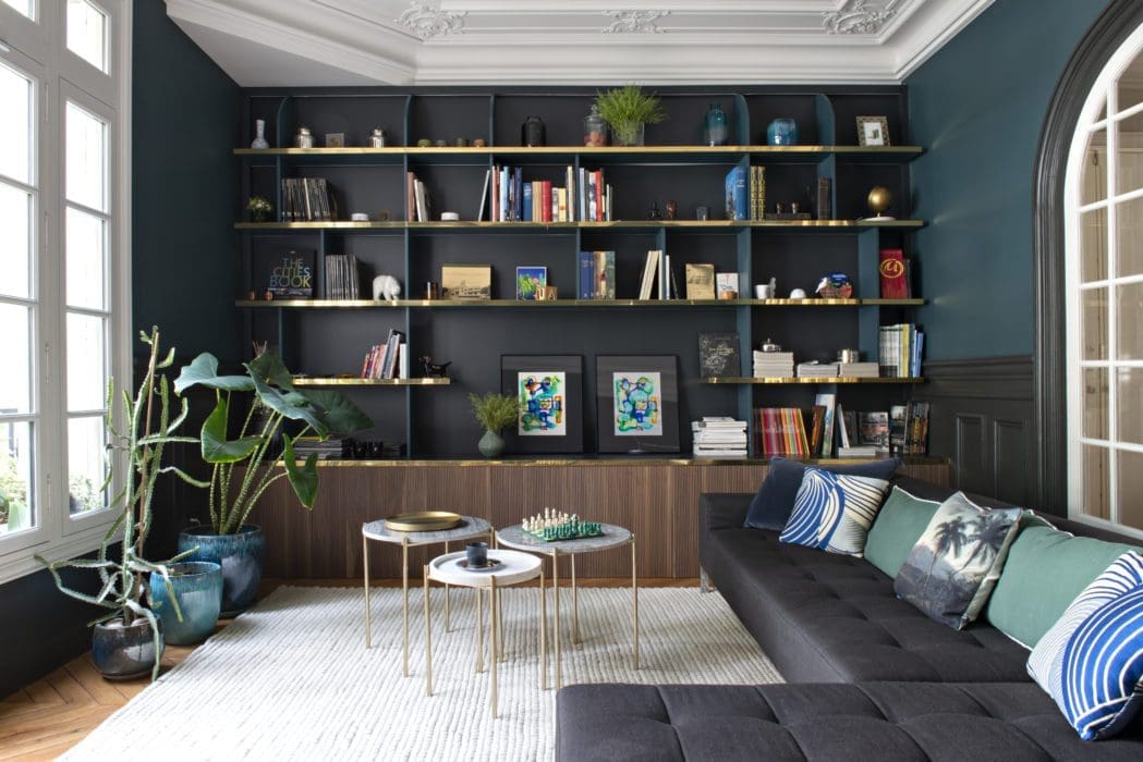 Afin que cet appartement très traditionnel devienne convivial, en phase avec le mode de vie actuel des parents autant qu’avec celui des enfants, Nicolas Bossard a imaginé un salon, pièce à vivre située à l’opposé de la partie réception. « Les membres de la famille s’y succèdent ou s’y retrouvent selon les heures, pour lire, jouer du piano, disputer des parties de cartes, de jeux de société. » Le décorateur le traite à la façon d’un cabinet de curiosités anglais, choisit des teintes de la Maison Ressource, plus enveloppantes, un vert anglais et un noir.