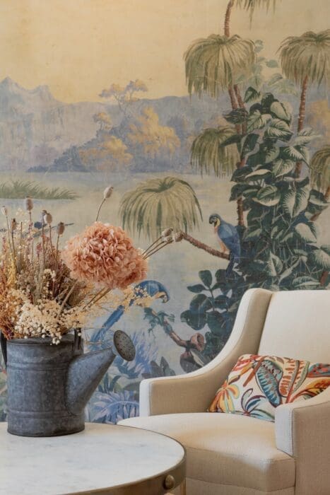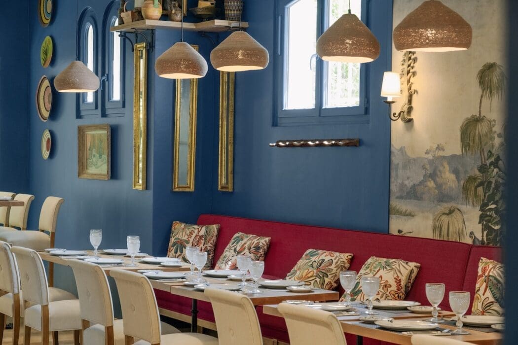 Son idée bien arrêtée, Monsieur le PDG demande à Didier Six, directeur des opérations immobilières de prendre le relais. Aussitôt dit aussitôt fait. Six réunit Pedro Rodrigues, architecte, et Manon Mallac Koenig, décoratrice, avec comme maître mot : conserver l’originalité de la propriété, avec ses défauts, son caractère. « Nous avons reçu comme consigne de nous inspirer des objets, du bric-à-brac, de la personnalité d’Un Moment chez Mémé, explique Manon. J’ai abordé le chantier dans cet esprit, épaulée par Philippe Daraux, créateur de la maison Mis en Demeure. J’ai pris ce projet à bras-le-corps, avec enthousiasme, raconte la décoratrice née à l’île Maurice. Cela m’a plu de créer un décor véritable chemin de vie pour accompagner aussi bien les jeunes lors de leur première acquisition, que des clients plus avertis, rompus aux démarches financières, aux ventes, à la rénovation. » L’agence ouverte l’été dernier semble avoir toujours été là, avec ses objets chinés, sa grande bibliothèque. « On s’est même inspiré du papier peint bleu qui était au mur, privilégiant les couleurs franches, un vrai bleu habillé de touches plus fortes, framboise écrasée par exemple. On a marié un beau panoramique Amazonia de Mis en Demeure avec du bois foncé, des tapis anciens plus ou moins décolorés. Et ça fonctionne, puisque comme nous le souhaitions, très vite “Un Moment Barnes” est devenu à l’image de son aîné “Un Moment chez Mémé”, un carrefour où se croisent les épicuriens, les amateurs d’art, les joueurs de boules, les investisseurs et les acheteurs. » Unique en son genre.