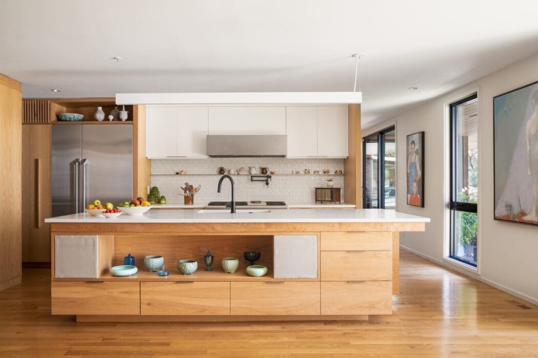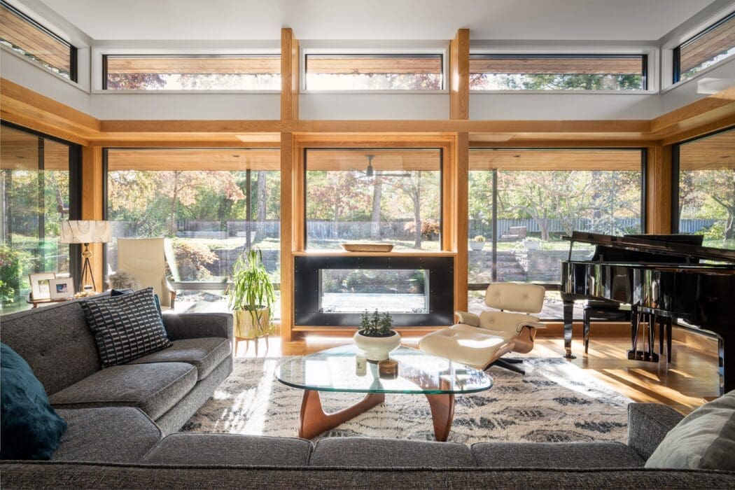 Et le maître d’œuvre de dialoguer avec la maison. Pourquoi pas ! « Mon objectif, en parfait accord avec les propriétaires, n’était pas de créer une nouvelle architecture mais plutôt de libérer, après l’avoir comprise, la construction existante, pleine de potentiel, comme l’assurent les agents immobiliers. Nous nous sommes posés de longues heures devant la façade songeant “si seulement nous pouvions ne changer qu’une seule chose”. Et soudain l’évidence ! Cette chose à changer, c’était le toit riquiqui ne coiffant que la partie centrale du ranch, ni beau, ni bien fait, en vilain matériau de surcroît. En avant toute ! Nous nous sommes transformés en modistes pour doter la demeure d’un énorme chapeau en pin biosourcé modifié certifié FSC, de Kebony. Une fois ce bois adopté pour le toit, nous avons décidé de l’utiliser aussi à l’intérieur. » Une frénésie ! Encadrements des fenêtres agrandis, cadres des moustiquaires, soffites pour les plafonds. Tout a découlé de ce fameux toit et de ce bois. Ils ont même récupéré des lattes pour relier, à l’arrière, le toit à la terre, créant ainsi une sorte d’abri dont la cloison sert également de clôture infranchissable. Le toit-chapeau devient un refuge donnant sur l’extérieur, et le grand salon percé de fenêtres connecte toute la maison au jardin et bien au-delà.