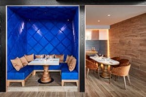 Une décoration accueillante et conviviale – nombreuses déclinaisons de tons chauds et de bleus, de pièces de mobilier tout en courbes – … pour vous offrir un moment hors du temps dans de véritables salons privés.