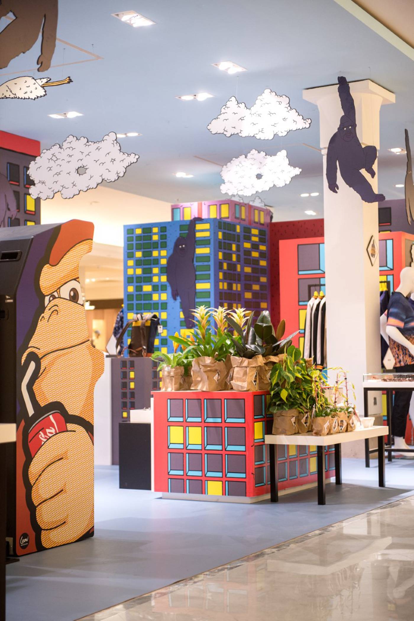 À l’approche de l’été, le Bon Marché Rive Gauche accueille de nouveaux locataires inattendus. Les gorilles, imaginés par l’illustratrice Ana Tortos, investissent la ville et s’installent en nombre dans les vitrines et au rez-de-chaussée du magasin. À l’occasion de l’exposition « Attention aux gorilles », du 8 Avril au 31 Mai, ils font souffler un vent d’exotisme et de chaleur sur la ville. Deux univers distincts dédiés à l’Homme et à la Femme, mettent en scène des imprimés tropicaux, des objets design et high-tech sélectionnés par la Galerie Imaginaire.