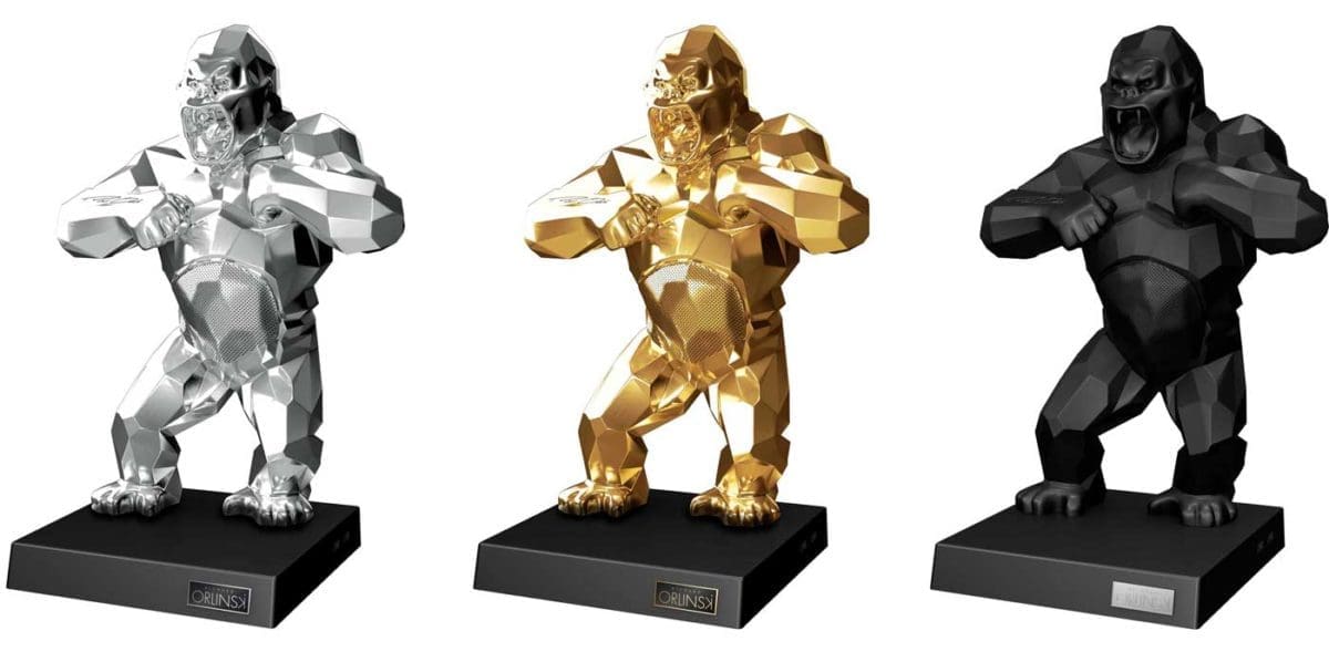 On ne présente plus Richard Orlinski, devenu en quelques années le sculpteur français le plus vu et vendu dans le monde, de Saint-Tropez à L.A. en passant par Dubaï. Ni son iconique « Wild Kong » en résine, qui anime jusqu’aux pistes de Courchevel. Féru de technologie, le trublion de l’art contemporain s’associe aujourd’hui à Kiwi Box, pépite de la « French Tech » qui cartonne avec sa borne de recharge universelle pour smartphones et tablettes. Ensemble, ils créent Kiwikong, une enceinte connectée à l’effigie du célèbre gorille martelant son torse dans lequel se cachent trois haut-parleurs. Bluetooth, l’enceinte est aussi dotée d’un chargeur sans fil à induction et de deux ports USB.