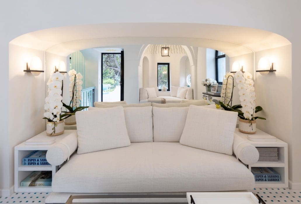 « Amoureuse transie de Capri, j’y vais depuis plus de 25 ans. Je m’y suis même mariée, c’est dire mon attachement à cette île. J’aime ses paysages, ses fleurs, ses parfums, ses couleurs, son ambiance. J’y séjourne régulièrement à partir de mai et m’y installe avec mon mari et mes filles pendant tout le mois d’août. C’est ma parenthèse bonheur, ma respiration. À chacun de mes séjours, je rêvais de posséder une des huit maisons érigées en suspension au-dessus de la mer, face aux Faraglioni. J’avais contacté toutes les agences “au cas où”. Mais ces biens se négocient la plupart du temps par bouche-à-oreille. Et miracle, pendant le confinement, un agent immobilier m’appelle pour me signaler une villa mise en vente. Description, plan, photos… je m’emballe. Mon mari tente de modérer mon enthousiasme, de m’inciter à attendre de la visiter, ce qui était impossible compte tenu de l’interdiction de se déplacer. Je m’entête, envoie l’offre d’achat puis signe peu de temps après. J’ai attendu quatre mois pour découvrir enfin “ma” maison. Je vous avoue que j’avais le cœur battant en y pénétrant. »
