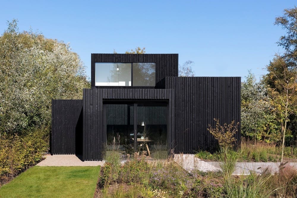 À l’extérieur, la diversité des tailles et le positionnement interconnecté créent une image sculpturale, différente sous tous les angles. Afin d’intensifier cette qualité sculpturale, toutes les façades ont un design minimal avec des extrémités de toit invisibles et des cadres de fenêtres détaillés derrière la façade en bois.