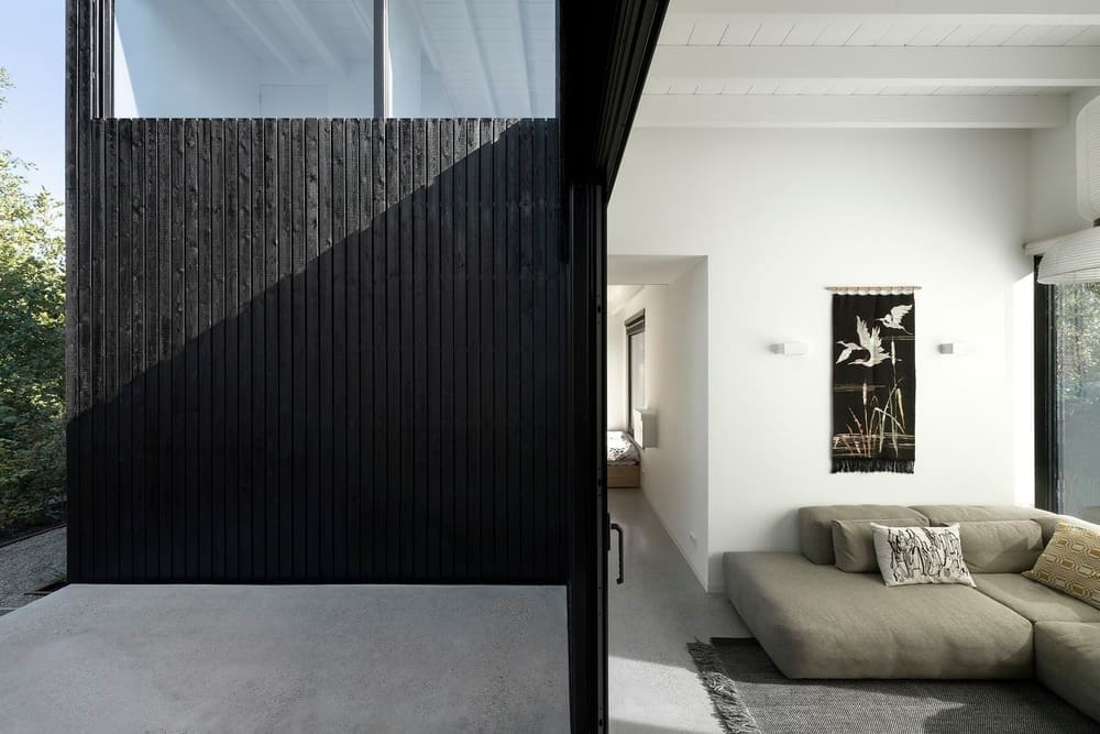 Les meubles sur mesure et les armoires accentuent la vision graphique à l’intérieur. L’équipe de conception a utilisé des matériaux simples comme des panneaux en bois de chêne naturel – ou teinté en noir pour combiner avec la façade en pin brut – et un sol en béton poli. Chaque volume a sa propre identité. En liant les composants intérieurs à l’architecture et vice versa, le résultat se veut simple avec des matériaux peu coûteux et sans prétention, pour un résultat de haute qualité.