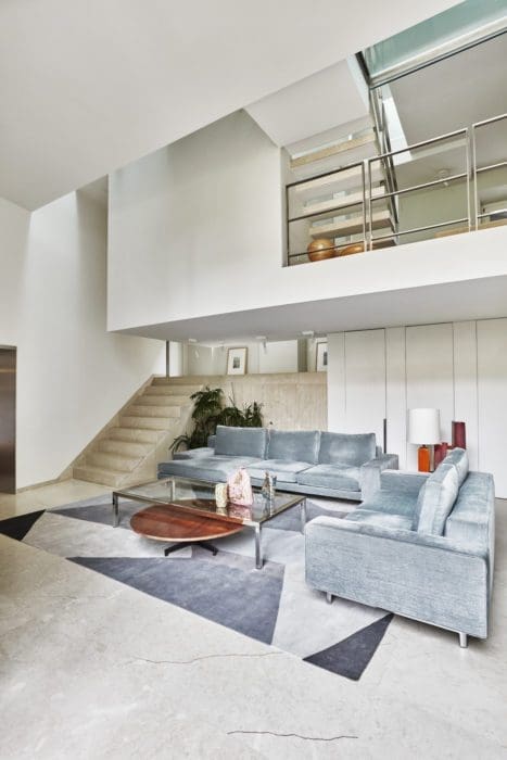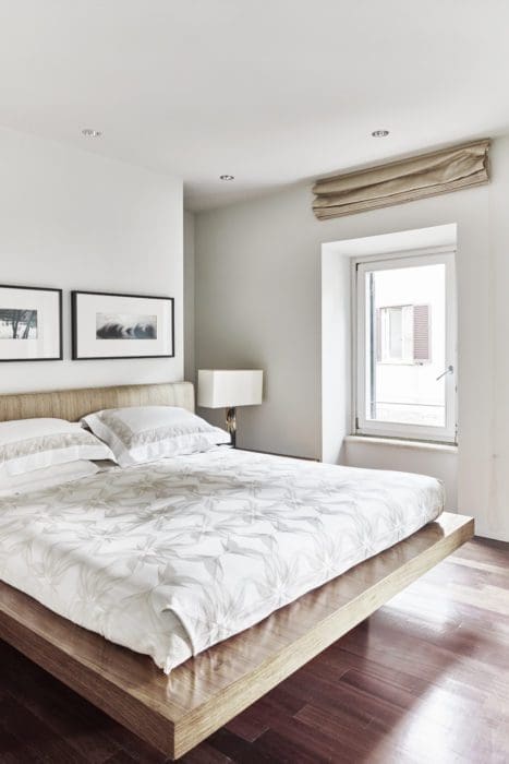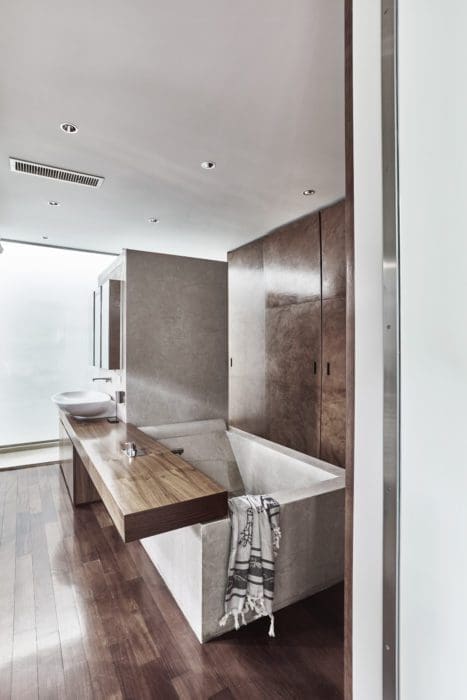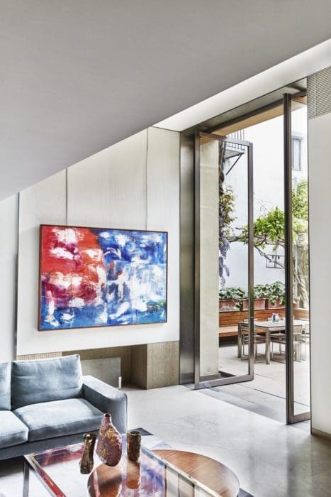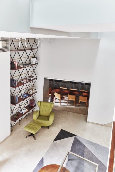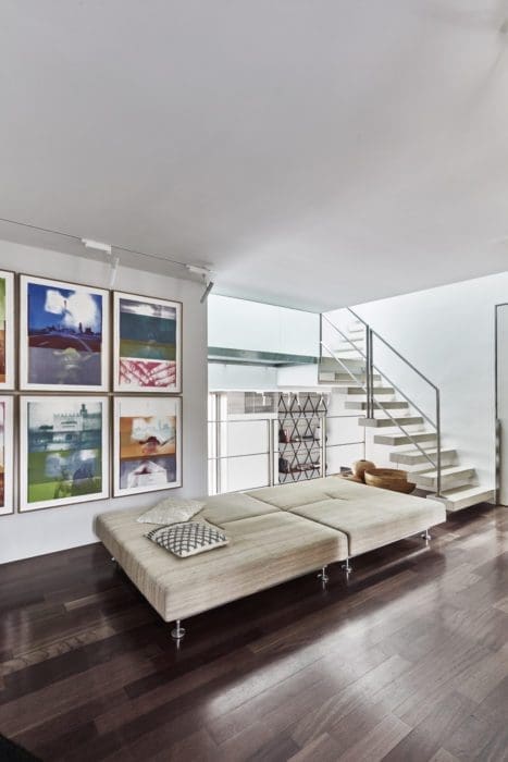 Lors de la conception de pièces décloisonnées, il est important d’avoir des rangements intégrés : Massimo Adario a donc totalement fondu ces éléments dans les murs de chaque pièce. À peine visibles, si ce n’est par leurs poignées en métal, ces rangements spacieux sont une solution chic et ingénieuse qui participe à la fonctionnalité et au style épuré de l’ensemble. Surprise ultime dans le salon, où le placard intégré contient à la fois des toilettes pour les invités et un ascenseur caché, qui mène à la chambre du second étage.