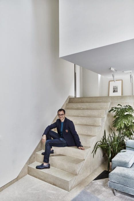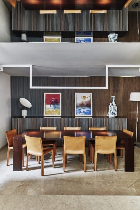 Désormais, « la disposition des pièces s’articule autour d’une spirale qui serpente à travers les différents étages », explique Massimo Adario. « Grâce à son alternance d’espaces ouverts et fermés, de zones d’ombre et de lumière, cette maison convient bien à une famille moderne qui souhaite à la fois passer du temps ensemble mais aussi préserver l’intimité de chacun. Par exemple, en levant les yeux depuis le salon, on peut voir le bureau puisqu’il s’agit d’un volume ouvert », précise-t-il. L’architecte a pensé chaque détail, mais surtout le lien, primordial, qu’il tenait à créer entre les espaces. Ainsi, l’ouverture entre le salon et la salle à manger présente un plafond en miroir et des plaques de métal réfléchissantes, qui créent un effet de perspective intéressant et rendent surtout la pièce plus grande qu’elle ne l’est réellement. Par ailleurs, cette astuce éclaire cette zone qui, sans cela, serait bien trop sombre. Autre bonne idée, « l’utilisation de plusieurs matériaux différents, qui donne de la profondeur à une pièce », révèle Massimo Adario, qui a conçu de nombreux éléments de décoration ensuite soigneusement positionnés pour rendre cet intérieur élégant et agréable à vivre. Mise en application concrète avec le salon, qui offre un accès direct au jardin de 300 m2 : cette pièce, de réunion mais aussi de passage, est revêtue d’un somptueux carrelage en pierre calcaire de Comiso. Tandis qu’au premier et second étages, l’architecte a joué le contraste avec des chambres et un vaste bureau qui arborent un joli parquet en bois foncé. Résultat : davantage de chaleur pour ces endroits privatifs de la maison. « Pour moi, la matière et le design sont très importants. J’aime jouer avec la forme des meubles et rendre une pièce plus sophistiquée en quelques mouvements. Cette maison de Nepi est un bel exemple de la façon dont les deux vont de pair », sourit Massimo Adario.