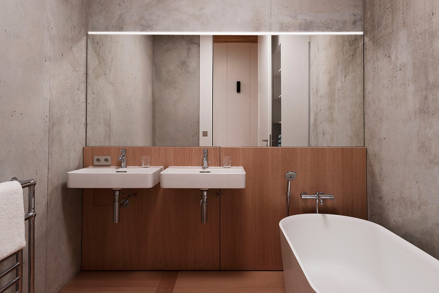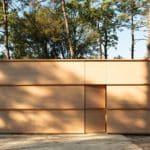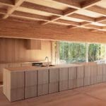 136 caissons de mélèze pour le toit, 136 plaques d’okoumé au sol, une symétrie parfaite pour ce sandwich architectural. Si la ligne générale s’inspire de la villa américaine de plain-pied, le sol et le plafond relèvent de la performance d’ingénierie dont la paternité est à chercher chez John Lautner et ses architectures ouvertes à un nouvel art de vivre.