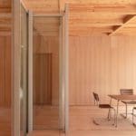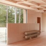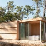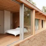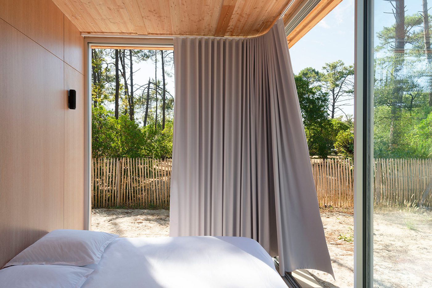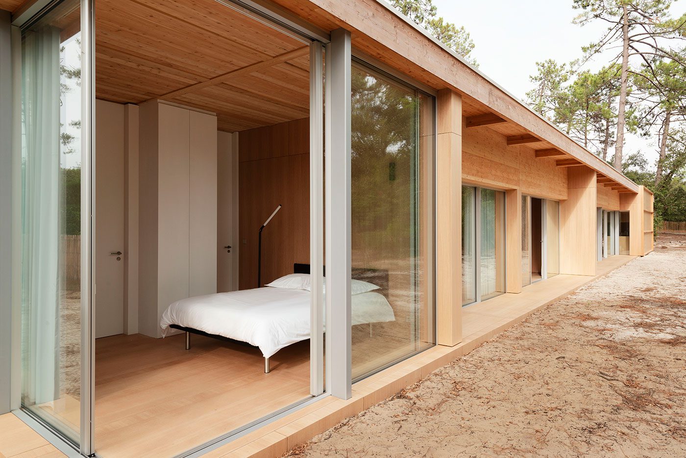 Le sol et le plafond aux dimensions rigoureusement identiques impriment un effet miroir qui brise tout idée de hiérarchie ; le regard glisse entre les pins et les perspectives intérieures, le pied passe sans heurt du sable chaud au plancher souple d’okoumé.