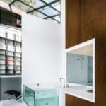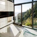 Le volume inférieur, une suite parentale à double porte-à-faux, agit comme un promontoire au-dessus de l’océan, offrant une vue imprenable depuis ses fenêtres du sol au plafond. Le lien entre ces deux volumes est la bibliothèque de verre, c’est le foyer de la maison, une pièce qui unit la maison à l’intérieur comme à l’extérieur par sa géométrie et sa transparence.
