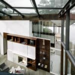 La ventilation des cheminées est naturellement facilitée par l’aménagement du bâtiment. Le plan d’étage ouvert est connecté à plusieurs niveaux de la suite parentale. Le vitrage fonctionnel à commande automatique au niveau le plus bas est coordonné avec une grille de transfert d’échappement à la plus haute élévation. Le différentiel de pression et de hauteur permet l’épuisement de l’air chaud et le stockage d’air frais et froid.