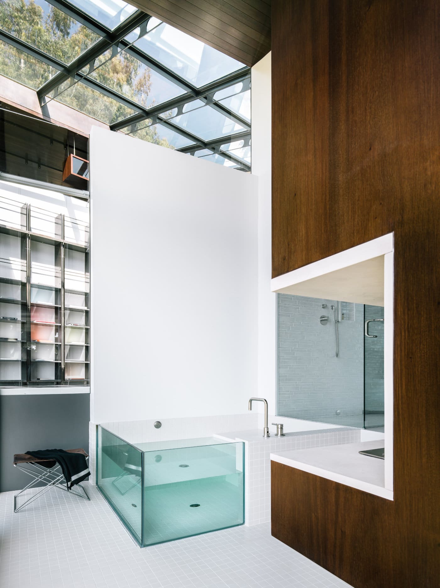 Le volume inférieur, une suite parentale à double porte-à-faux, agit comme un promontoire au-dessus de l’océan, offrant une vue imprenable depuis ses fenêtres du sol au plafond. Le lien entre ces deux volumes est la bibliothèque de verre, c’est le foyer de la maison, une pièce qui unit la maison à l’intérieur comme à l’extérieur par sa géométrie et sa transparence.