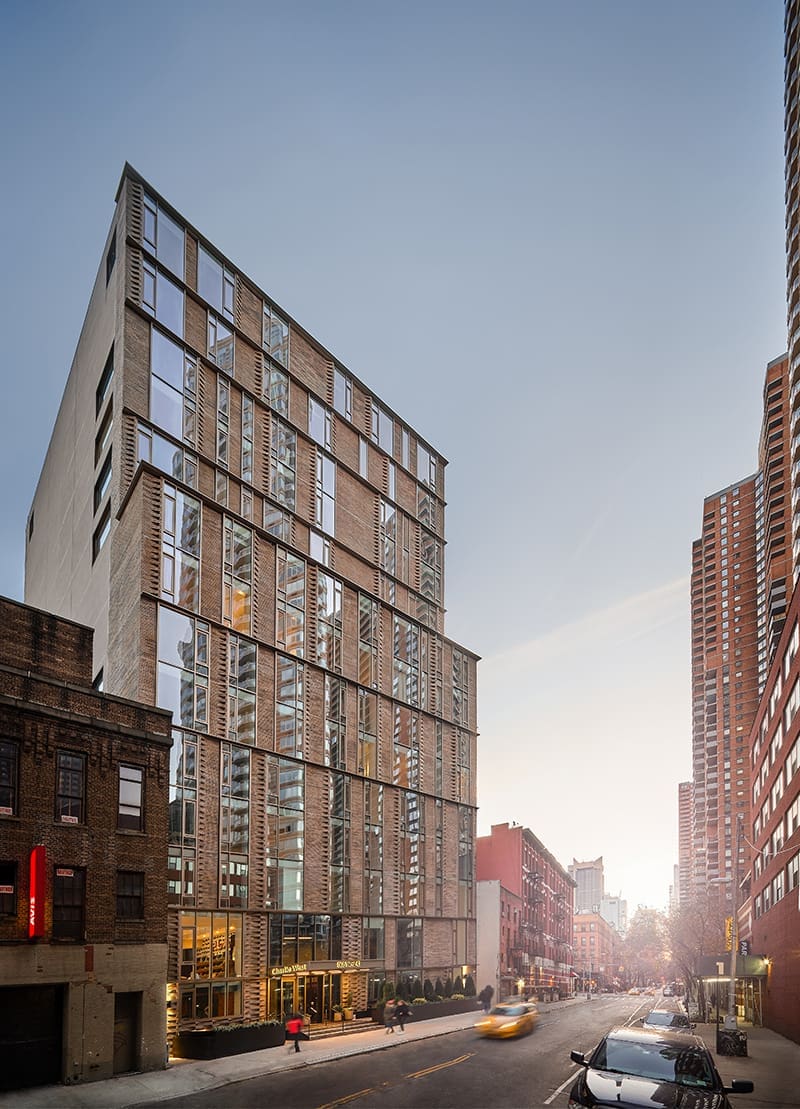 Séparant judicieusement le complexe en deux bâtiments distincts pour donner lieu à une cour élégante, le design reprend les caractéristiques des constructions d’acier qui ont marqué l’histoire du quartier tout en combinant le luxe et le modernisme actuel de Hell’s Kitchen. La façade en brique s’intègre aux bâtiments voisins tandis que l’articulation de la devanture introduit un élément sculptural qui se distingue par sa profondeur et son style.