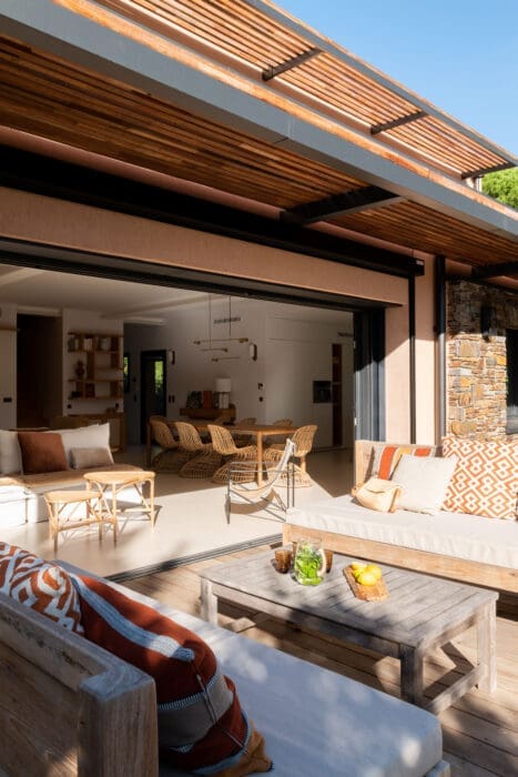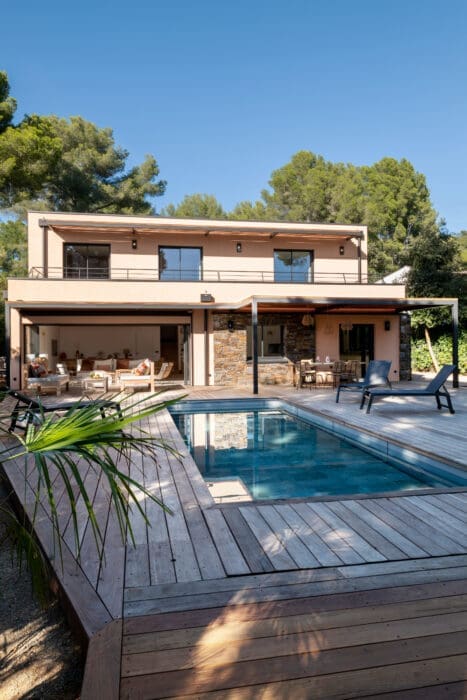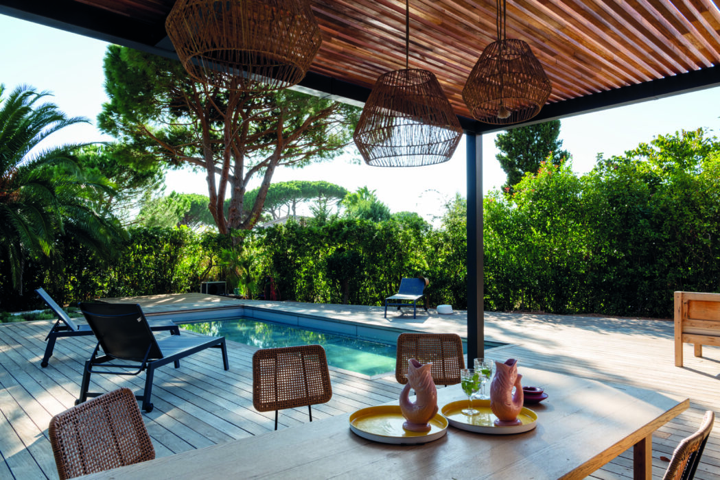 Au rez-de-chaussée, la cuisine, communicante avec le séjour, est placée à l’écart, laissant le salon trôner en pièce maîtresse. Pour ne pas nuire à la fluidité du plan ouvert, l’accès à l’arrière-cuisine a été dissimulé derrière un placard, telle une porte dérobée. Le coin salon convoque le dehors et l’invite à faire partie du décor. Il devient en un claquement de baie accordéon un espace mi-intérieur mi-extérieur. La mise en scène du double sofa « dos à dos » est astucieuse pour créer deux zones bien distinctes. L’une face à la table basse, l’autre face à la vue, en spectateur… Entre les arbres, la mer Méditerranée se devine discrètement, prolongeant les rêveries au son des cigales. La terrasse en bois, parée d’une pergola filante en façade, est au même niveau que le sol du séjour, renforçant cette impression de profondeur, s’étirant vers des horizons bleutés. Trois des cinq chambres à l’étage s’ouvrent elles aussi sur cet infini. Deux autres chambres, « parentales », ont été prévues au rez-de-chaussée.
