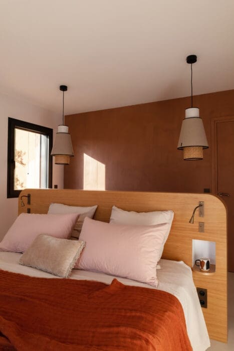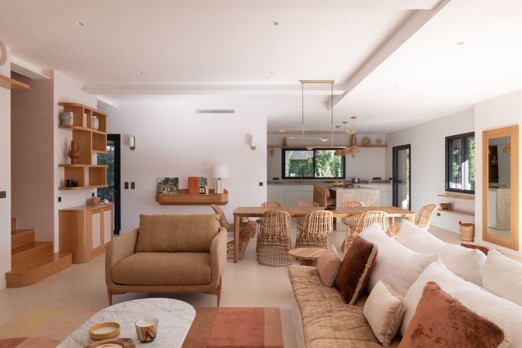 Les propriétaires avaient envie d’une palette de couleurs claires : « des tonalités douces, chaudes et lumineuses ». Incontournables de l’esprit « Sud », les teintes ocre se sont imposées presque naturellement, réchauffant l’ensemble. Elles ont été sélectionnées en lien avec les tons qu’offrent la nature et le soleil se posant sur la terre ou léchant les murs. Il en va de même pour les matériaux organiques et minéraux : dans la cuisine et les pièces d’eau, le mariage intemporel du bois et du marbre apporte du raffinement à cet intérieur élégant semé d’osier, de rotin et de lin, autant de touches bohème. Un véritable havre de paix, pour une parenthèse méditerranéenne…