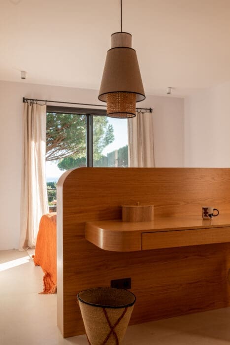 La Croix-Valmer, petite station balnéaire de 3 800 âmes située dans le sud de la France, est encore très préservée. Entre de discrètes criques aux eaux turquoise, de longues plages de sable fin et une végétation locale luxuriante, elle bénéficie d’une qualité de vie exceptionnelle. Tombés sous le charme de cette maison ancienne à l’architecture typique mais décrépite, les propriétaires font une nouvelle fois confiance à Transition Interior Design, contactée une année plus tôt pour la réalisation d’un projet personnel parisien. Pour redonner vie à la bâtisse, leur demande « version sud » est simple : « se fondre dans le décor et ne faire qu’un avec l’environnement ». Voilà donc la mission confiée aux deux architectes d’intérieur Margaux Meza et Carla Lopez, les cofondatrices de cette agence. Pour ce chantier d’envergure, elles s’appuient sur l’expertise d’une agence d’architectes DPLG qui gère le permis de construire de la nouvelle maison et la structure extérieure. Car tout est à démolir ou presque, seuls deux murs en pierre étant conservés, permettant ainsi une intégration maximale et un respect absolu du style local. Les jardins sont quant à eux confiés à un paysagiste afin de rester au plus proche des maquis et pinèdes alentour. Transition Interior Design, chargée initialement de l’intérieur, dessine et pense la forme globale, jusqu’aux pergolas et terrasses prolongeant la villa. Margaux et Carla optent immédiatement pour un jeu de courbes tout en rondeur dans les pièces, afin de contrecarrer la géométrie minimaliste et les formes cubiques des façades. Les galbes des menuiseries apportent ainsi douceur et légèreté à l’ensemble.