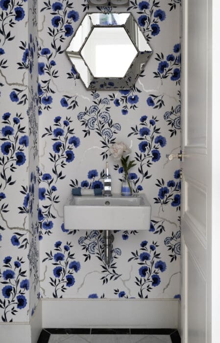 « À l’intérieur, qui est mon domaine, ma première idée, avec mon beau-frère, a été de créer un nouvel escalier reliant le rez-de-chaussée au premier étage et de souligner davantage encore le côté Art déco en posant au sol du marbre noir et blanc, en rénovant les parquets d’origine, les hautes plinthes et les portes à panneaux. Ensuite, pour lui apporter de la modernité, nous avons joué sur une palette de bleus, de blancs, avec quelques touches de jaune et de noir. Et nous avons chiné des objets, des meubles, en particulier à L’Isle-sur-la-Sorge, une manne. J’y ai dégotté des trésors. »
