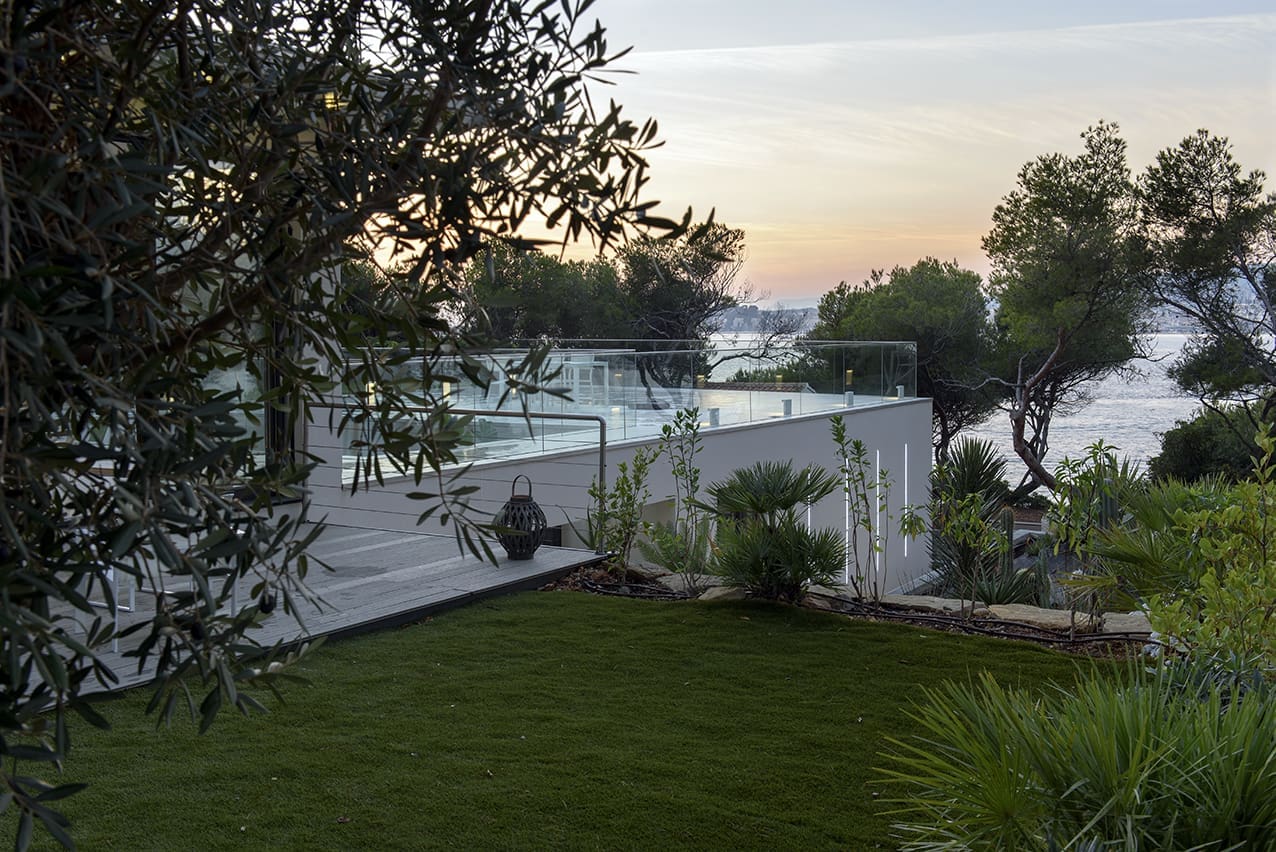 Dans le prolongement du salon se situe la grande terrasse, avec vue imprenable sur la Pinède et la mer. Le toit des chambres est de ce fait devenu une belle surface de terrasse surplombant la mer.