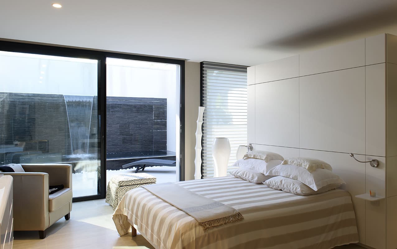 Ce niveau enterré, qui reçoit la suite parentale, est éclairé par un patio agrémenté d’un mur d’eau et d’un jacuzzi. De l’autre côté du patio, un deuxième corps de bâtiments face à la mer reçoit les chambres d’amis conçues en studios indépendants qui ont chacun une terrasse privée donnant aussi sur la mer.