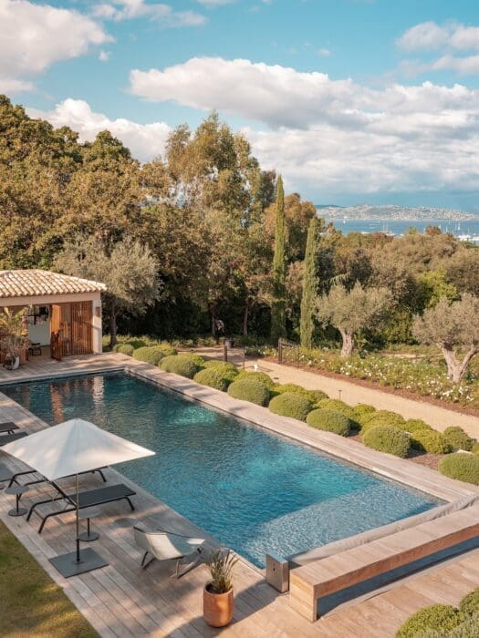 Mondain et amoureux de Saint-Tropez, aimant y vivre et y recevoir ses amis, ses relations, un homme d’affaires spécialisé dans l’hospitalité d’exception, a l’opportunité, il y a quelques mois, d’acheter sur un terrain de 11 000 m2, trois villas en enfilade. Un ensemble immobilier au calme, avec une vue dingue sur l’anse des Canoubiers et sur l’Esterel. La propriété, plantée de vignes, jouit d’une localisation remarquable à quelques minutes à pied du port, de la plage de Tahiti, celle qu’il préfère, sur la baie de Pampelonne avec ses cinq kilomètres de sable fin bordant les eaux méditerranéennes les plus limpides de la presqu’île tropézienne. En prime, elle jouxte quasiment les 12 hectares du Château de La Messardière, hôtel cinq-étoiles d’Airelles Collection. Le Spa Valmont, comme les restaurants et les bars sont accessibles aux personnes ne résidant pas dans le palace. Un plus.
