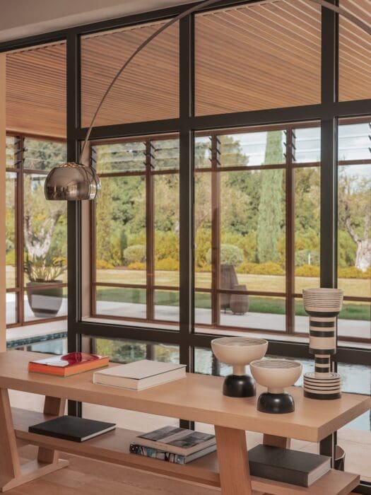 Pour que ces demeures répondent aux critères de confort du nouvel occupant, à ses exigences esthétiques, après avoir obtenu les permis de construire, il mandate l’architecte tropézien François Vieillecroze pour modifier et agrandir les trois villas. Celui-ci s’associe avec David Granata, dont il apprécie le travail pour concevoir et superviser l’ensemble de la décoration intérieure. Consignes reçues, explique David, « aménager une pépite haut de gamme, élégante, raffinée facile à entretenir et à vivre au quotidien, pouvant tout à la fois accueillir de nombreux invités mais agréable et fonctionnelle lorsque le propriétaire y séjourne seul. J’ai beaucoup échangé avec le commanditaire, noué peu à peu des liens d’amitié, de complicité, pour le comprendre, comprendre son mode de vie, deviner ses envies. Son souci premier : que cette maison soit sienne, ayant dès son achat éprouvé un attachement émotionnellement fort pour le domaine. Nous avons donc rédigé, ensemble, en parfaite adéquation, le cahier des charges. Il voulait que son domaine perché sur une colline, soit à la hauteur du paysage mêlant le vert de la campagne au bleu de la mer et à l’argent de l’Esterel. Un paysage époustouflant quelle que soit la saison. Intérieur comme extérieur devaient être bluffants. C’est ainsi que nous avons ensemble opté pour des matériaux haut de gamme, notamment des bois rares traités par la maison d’ébénisterie d’art de François Hertrich, de la pierre de Luget, du marbre, des meubles indoor et outdoor, des accessoires de designers, que j’ai en majorité trouvés dans le concept store B&B Italia à Saint-Tropez. Côté couleurs, j’ai choisi une palette s’harmonisant avec les matériaux. Pour le jardin, nous avons travaillé avec David Adriansen, architecte paysagiste DPLG, installé depuis quinze ans dans la région. Il maîtrise parfaitement la flore avare en eau, capable de s’adapter au climat, au terrain, et jongle entre les époques de floraison pour que le jardin soit toujours fleuri. Son parti pris, le même que le mien et celui du propriétaire : efficacité, esthetique, durabilité. Trio gagnant au long cours. »